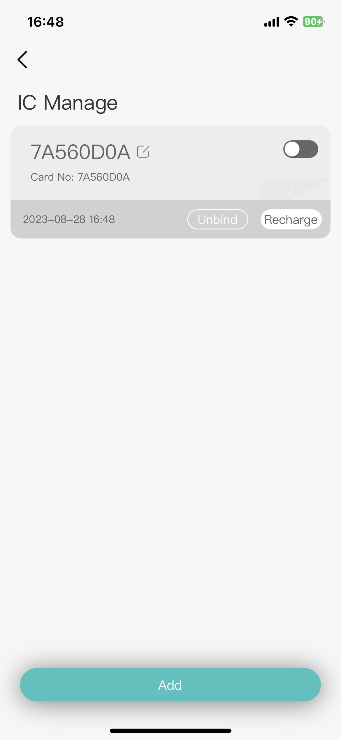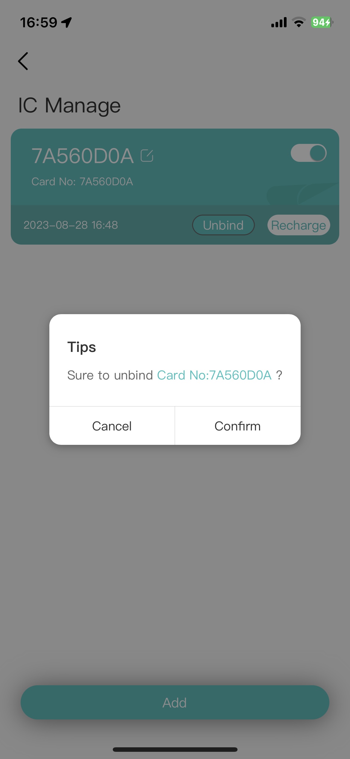 If your IC card is lost or you have no intention of continuing to use this IC card, you can unbind this IC card. After unbinding, this IC will not be able to continue to be used, unless you use the “Add” function again to connect this IC card to your device bound.