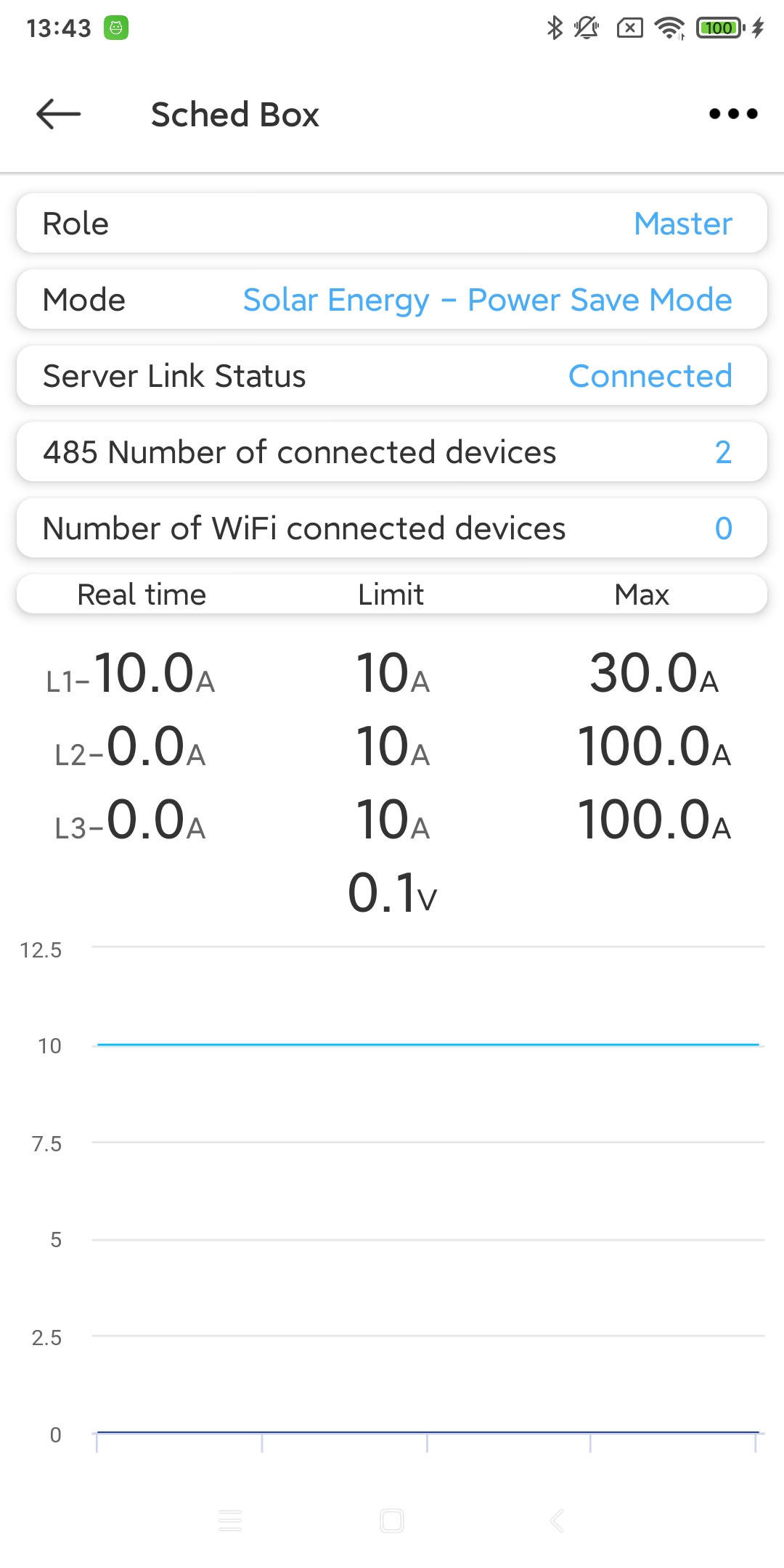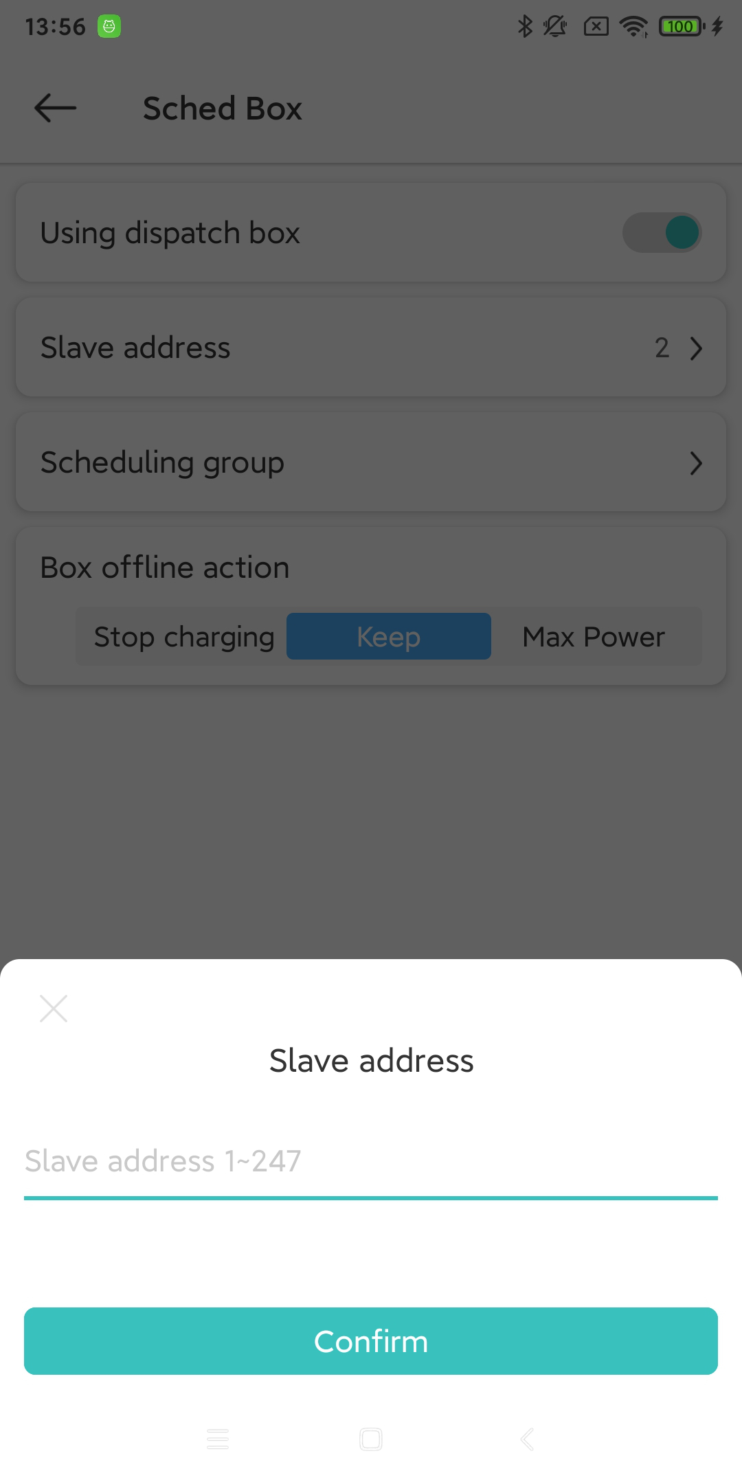 On the ‘More’ page, you can click the ‘Sched Box’ tab to enter this feature page. You need to enable this feature and set the charging pile device’s slave address, phase (multiple selections), and the behavior of the charging pile device when the Sched Box is offline.